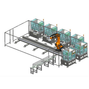 Robot flex connection solution, using robot + robot 7th axle track to achieve work piece transfer and station connection;